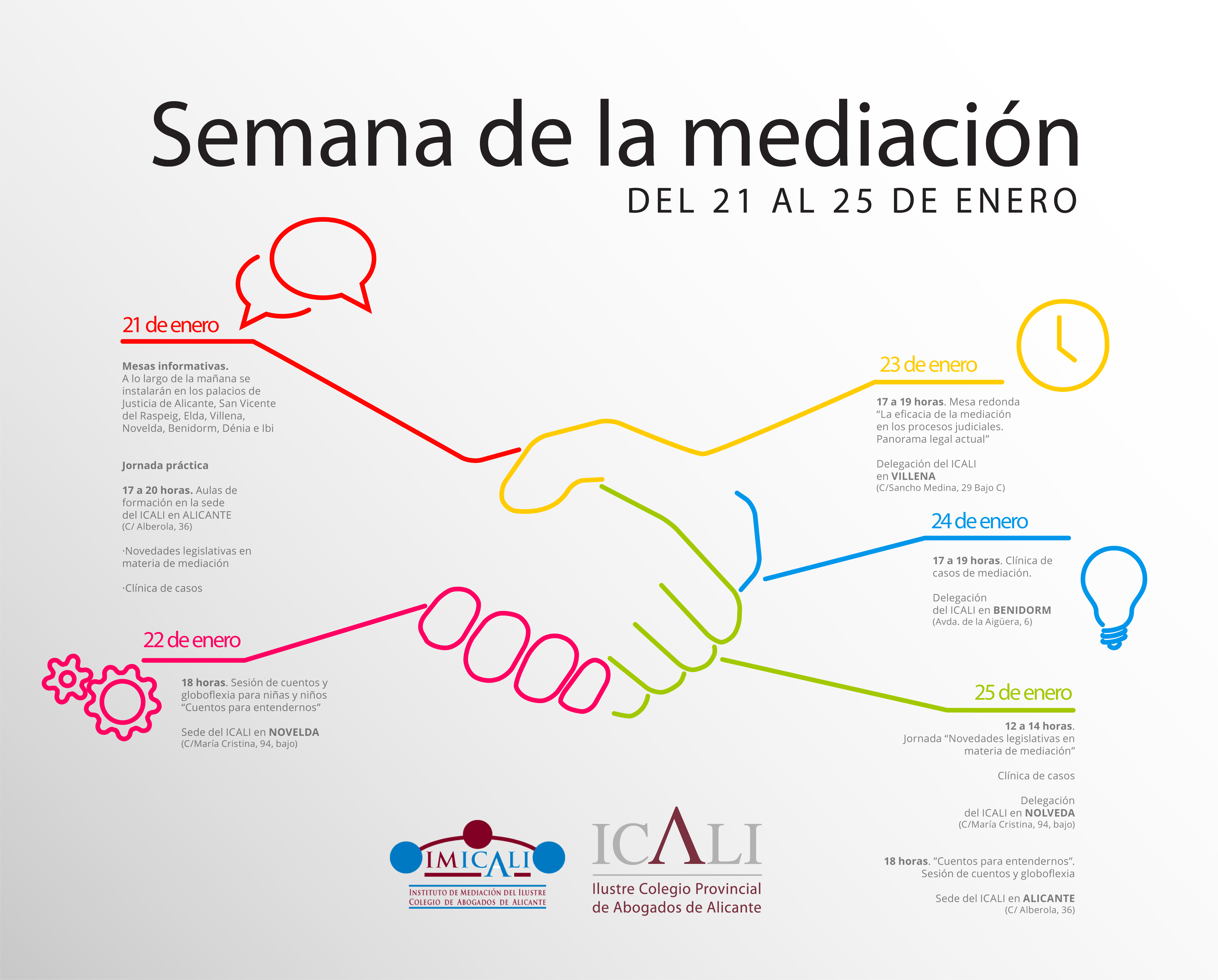 El Colegio Provincial de Abogados de Alicante (ICALI) ha organizado un completo programa de actividades con motivo de la celebración del Día Europeo de la Mediación, que tradicionalmente se conmemora el 21 de enero.