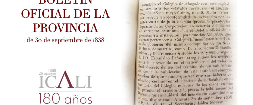 Hasta este momento, los documentos disponibles sobre la creación del ICALI se remontaban al año 1844, información recogida en el libro “150 años del Colegio de Abogados de Alicante”, publicado por el actual decano, Fernando Candela. No obstante, se deducía de la normativa de aquellos años que su fundación era anterior, aunque no se tenía documentación sobre la que basar esta afirmación. La investigación de la UMH ha logrado determinar que los inicios del ICALI datan del año 1838, tras el hallazgo de la documentación que así lo certifica.